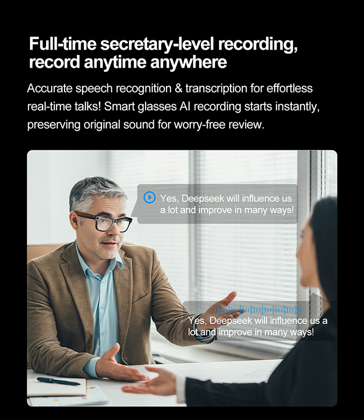 AI photo-taking and video recording fashionable smart glasses: A1 photo recognition, answering questions, taking photos, recording videos, AI dialogue interaction, Bluetooth calls, local music playback (switching, pausing music), low power consumption W20 main control chip, long-lasting battery life, dual physical buttons and dual touch buttons for convenient operation, 35g lightweight overall weight for comfortable wearing, customizable sunglasses, blue light protection, myopia, and other lenses, 260mAh large battery, IP65 dust and water resistance, ultra-low power consumption (supports continuous recording for over 2 hours without heating). Integrated with ChatGPT's advanced model, high accuracy in image recognition. App: LensMoo |