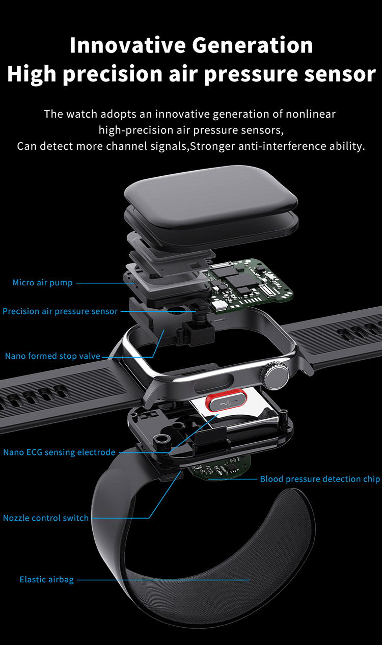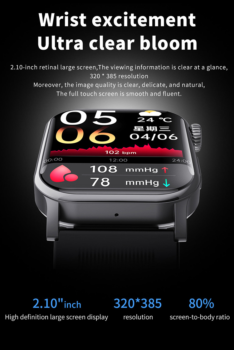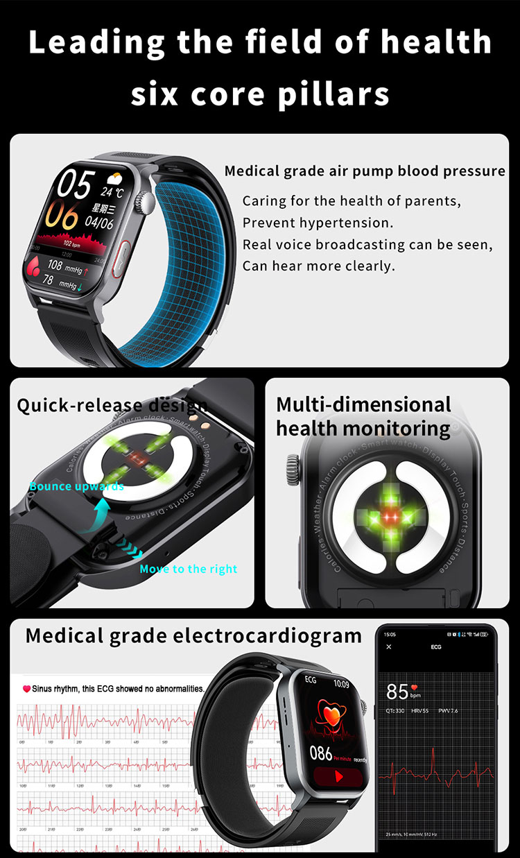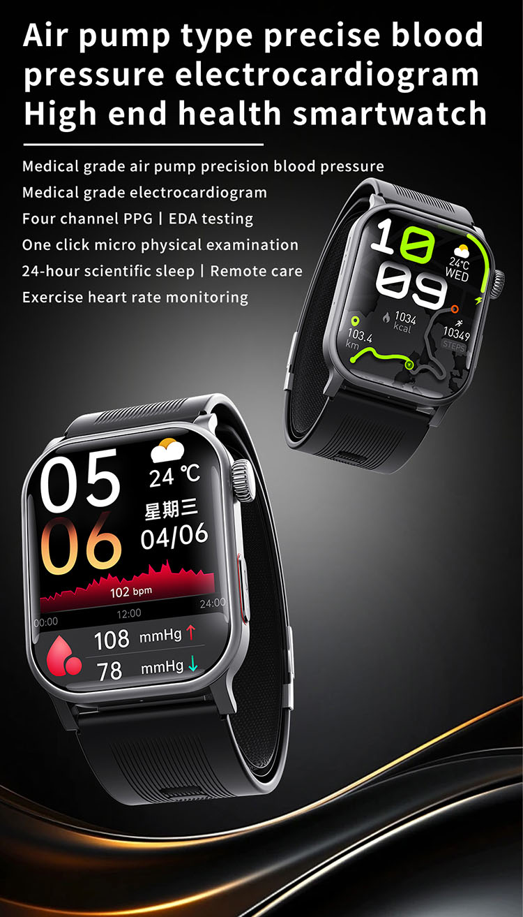 | Main functions | Important features: air pump blood pressure, medical grade ECG, heart disease risk assessment, 24-hour dynamic heart rate detection, mood management, depression risk assessment, 24-hour scientific sleep monitoring, red light blood oxygen, skin moisture analysis, cortisol detection, neural activity analysis, body composition, fall alarm, HRV report heart disease risk analysis, stress General functions: blood composition, methoxyphene, step counting, distance, calories, calls, voice assistant, heart rate, blood pressure, temperature test, breathing training, stopwatch, timer, calculator, call settings, time and date settings, mini-games, female menstrual cycle tracking, music playback, music control, remote photography, weather display, wrist raise to light up the screen, find phone (need to connect to APP), call reminder (caller number/name), message notification reminder, alarm reminder, standard reminder, sedentary reminder, heart rate alarm reminder, etc. |