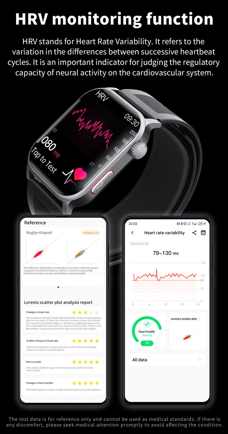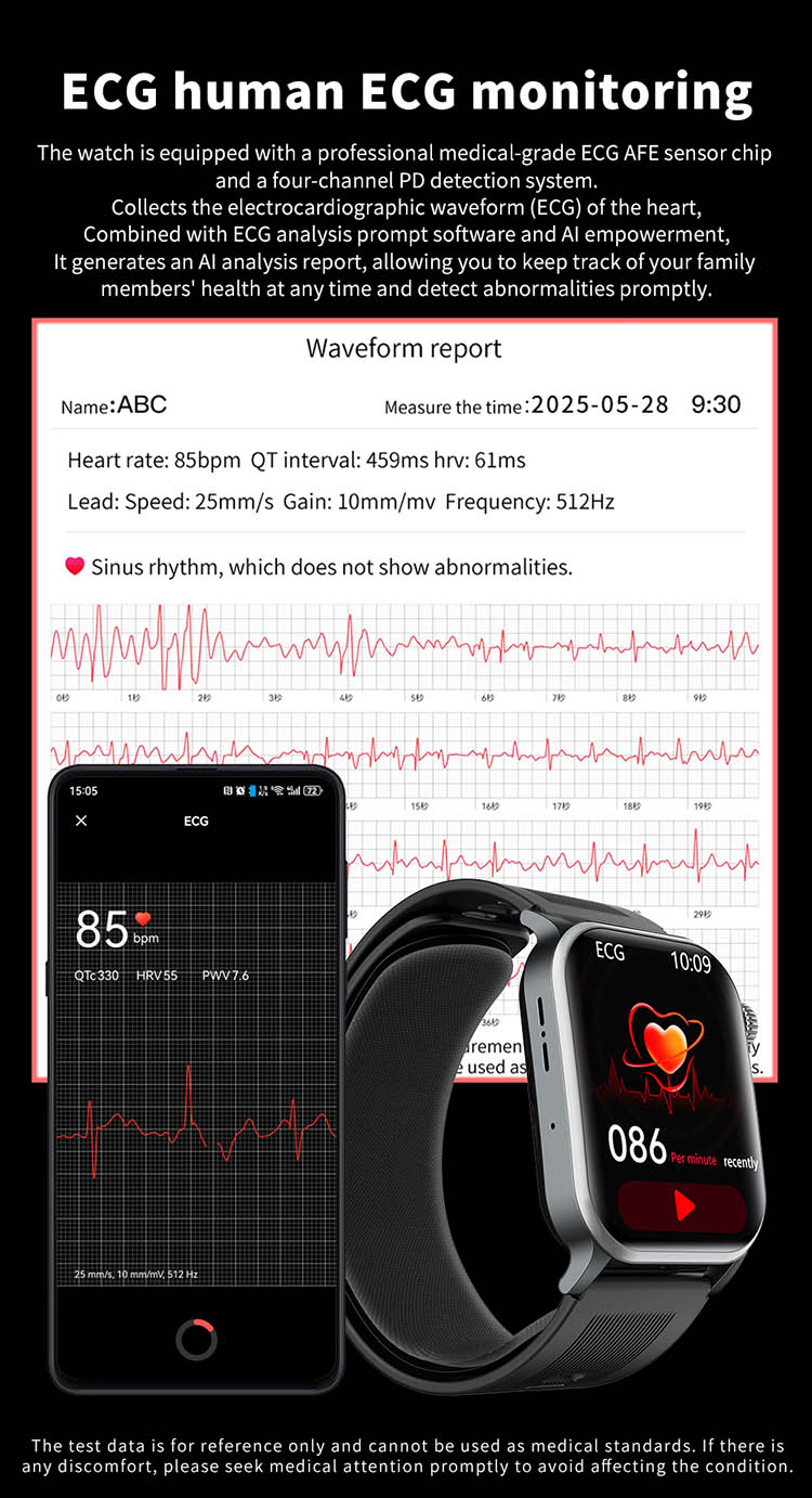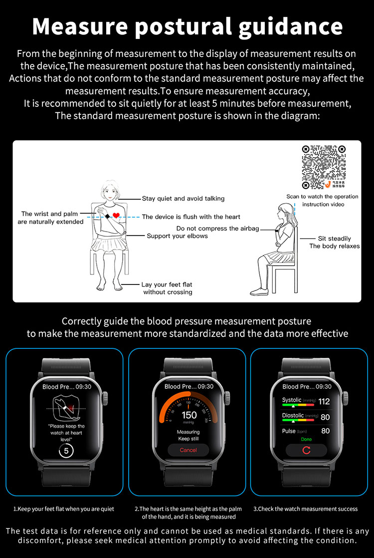 | Main functions | Important features: air pump blood pressure, medical grade ECG, heart disease risk assessment, 24-hour dynamic heart rate detection, mood management, depression risk assessment, 24-hour scientific sleep monitoring, red light blood oxygen, skin moisture analysis, cortisol detection, neural activity analysis, body composition, fall alarm, HRV report heart disease risk analysis, stress General functions: blood composition, methoxyphene, step counting, distance, calories, calls, voice assistant, heart rate, blood pressure, temperature test, breathing training, stopwatch, timer, calculator, call settings, time and date settings, mini-games, female menstrual cycle tracking, music playback, music control, remote photography, weather display, wrist raise to light up the screen, find phone (need to connect to APP), call reminder (caller number/name), message notification reminder, alarm reminder, standard reminder, sedentary reminder, heart rate alarm reminder, etc. |