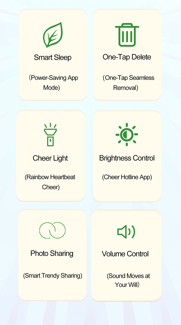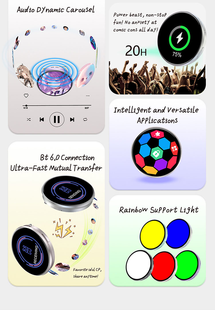 One click pairing and connection of dual Bluetooth chips, electronic bar playing Bluetooth music player, weather status reminder, voice assistant, password lock function, remote control of mobile phone photography, A and B electronic bars exchanging pictures and videos in seconds, drop-down interface control (send, receive, exchange, delete pictures, adjust brightness, turn on response lights, settings), 7-color response lights (support click frequency control), screen constantly on, device scanning connection, touch screen operation, static/dynamic image switching, low battery reminder, charging status display, transmission progress display, etc