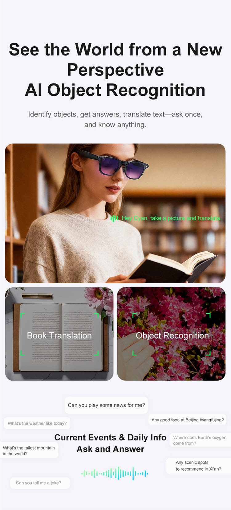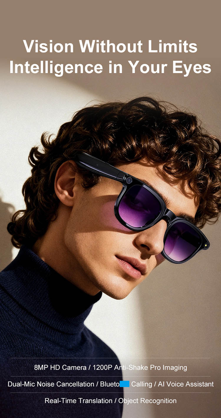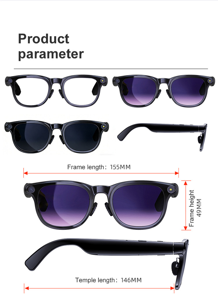 | Major function | 1, Shooting Function: 8MP HD camera for photos, 12MP anti-shake HD video recording 2, AI Translation: Dialogue translation (auto recognition), simultaneous interpretation (real-time translation) 3, AI Assistant: Integrated with Chat GPT large model, AI dialogue, rapid AI image recognition 4, BT Calling: Answer calls, reject calls 5, Other Functions: Music playback, voice recording, photography, video anti-shake, dual-mic noise cancellation, dual speakers, wear detection, Wi-Fi transfer, voice wake-up |