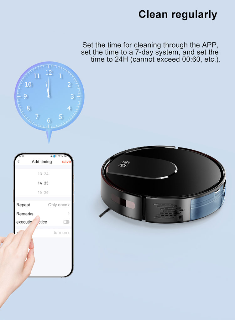 APP Remote Control: Manage your robot anytime, anywhere via the mobile app. Features include remote start/stop, scheduled cleaning, customized cleaning plans, and real-time progress tracking.