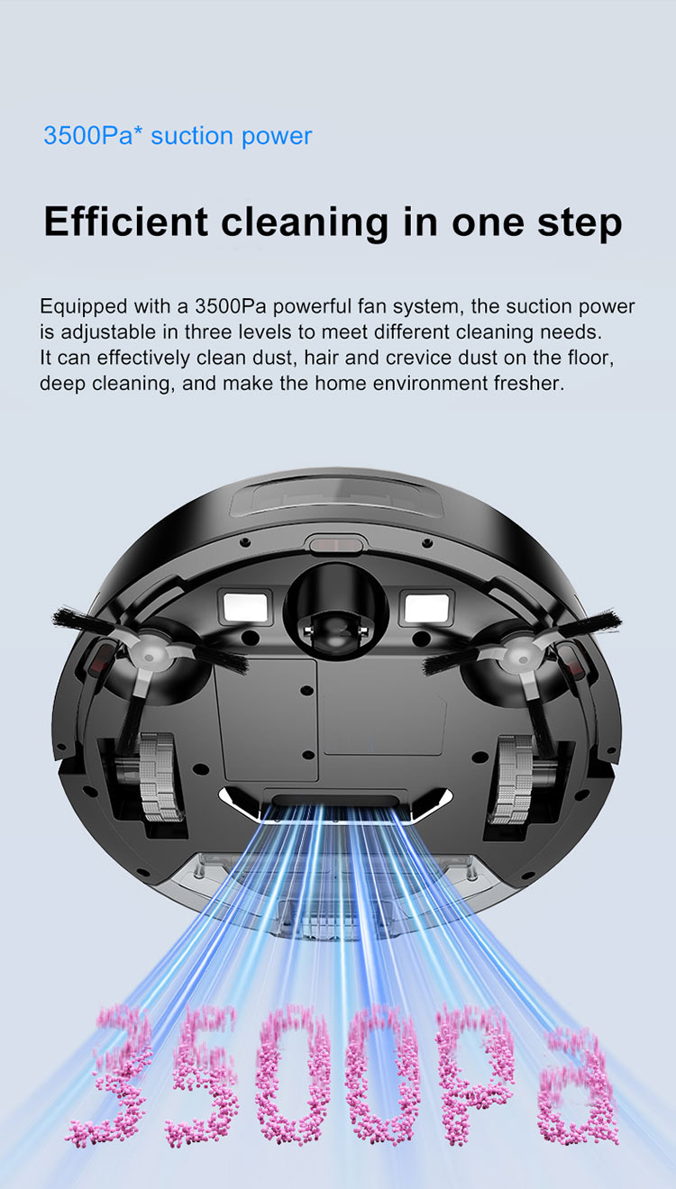 3500Pa Strong Suction: Delivers powerful suction to effectively remove dust, pet hair, debris, and stubborn dirt from all floor types.