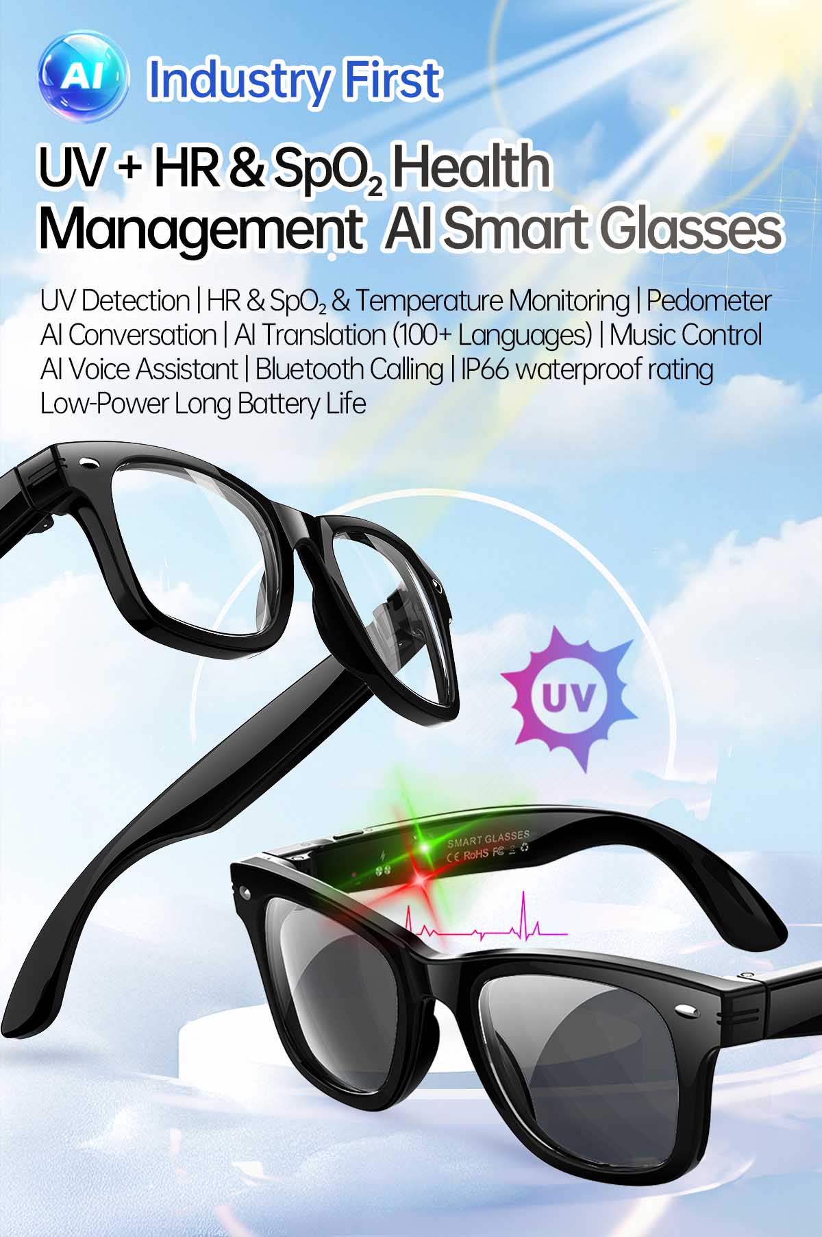 These smart glasses pioneer the integration of UV detection with heart rate & blood oxygen health management into a wearable device. Whether you’re outdoors or on the go, it continuously monitors: