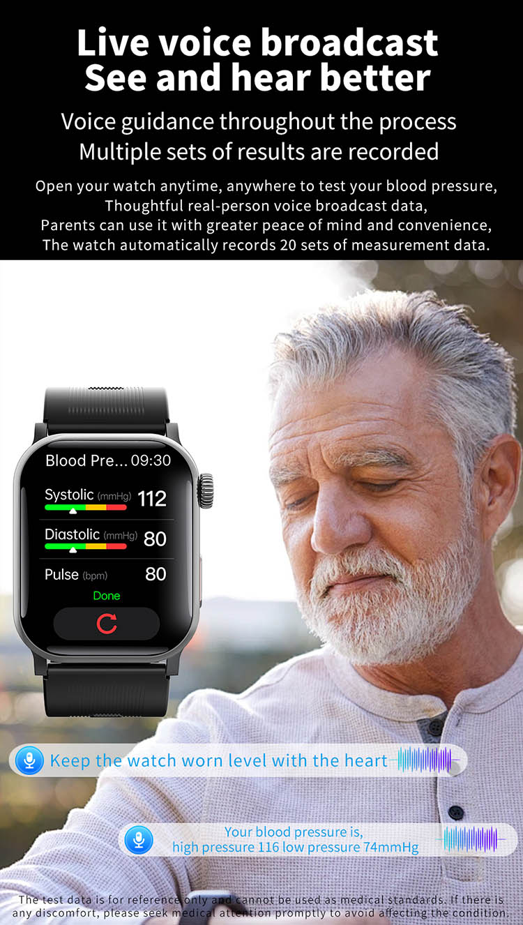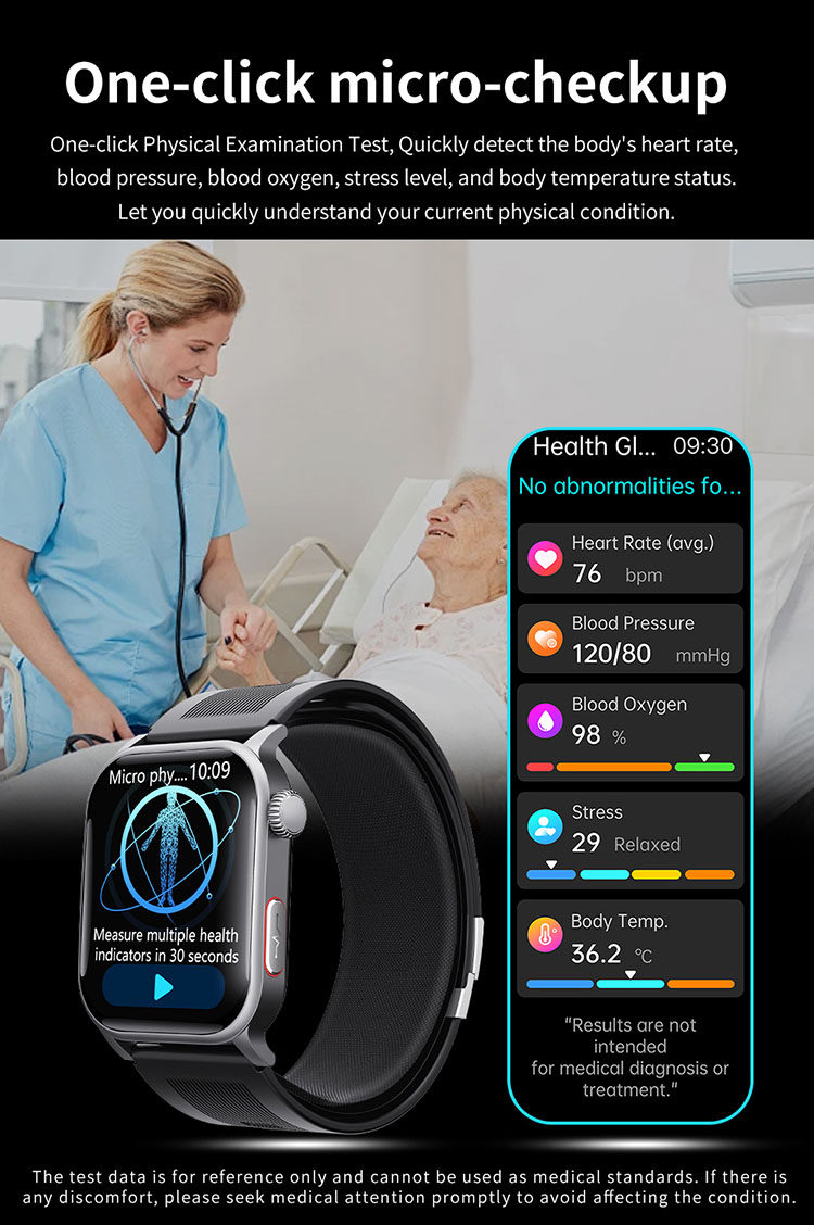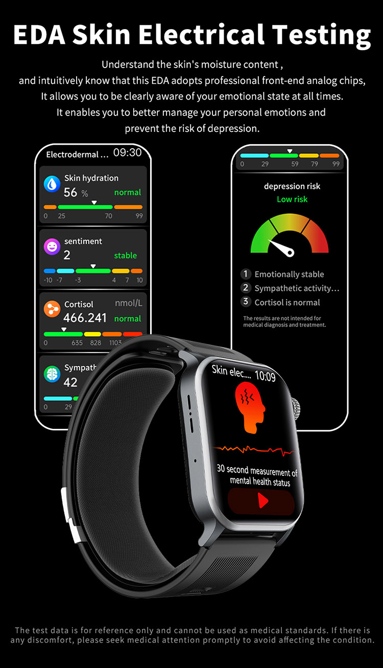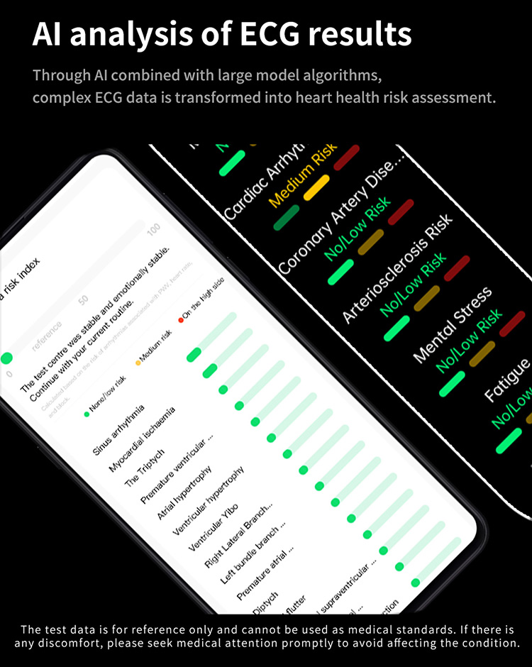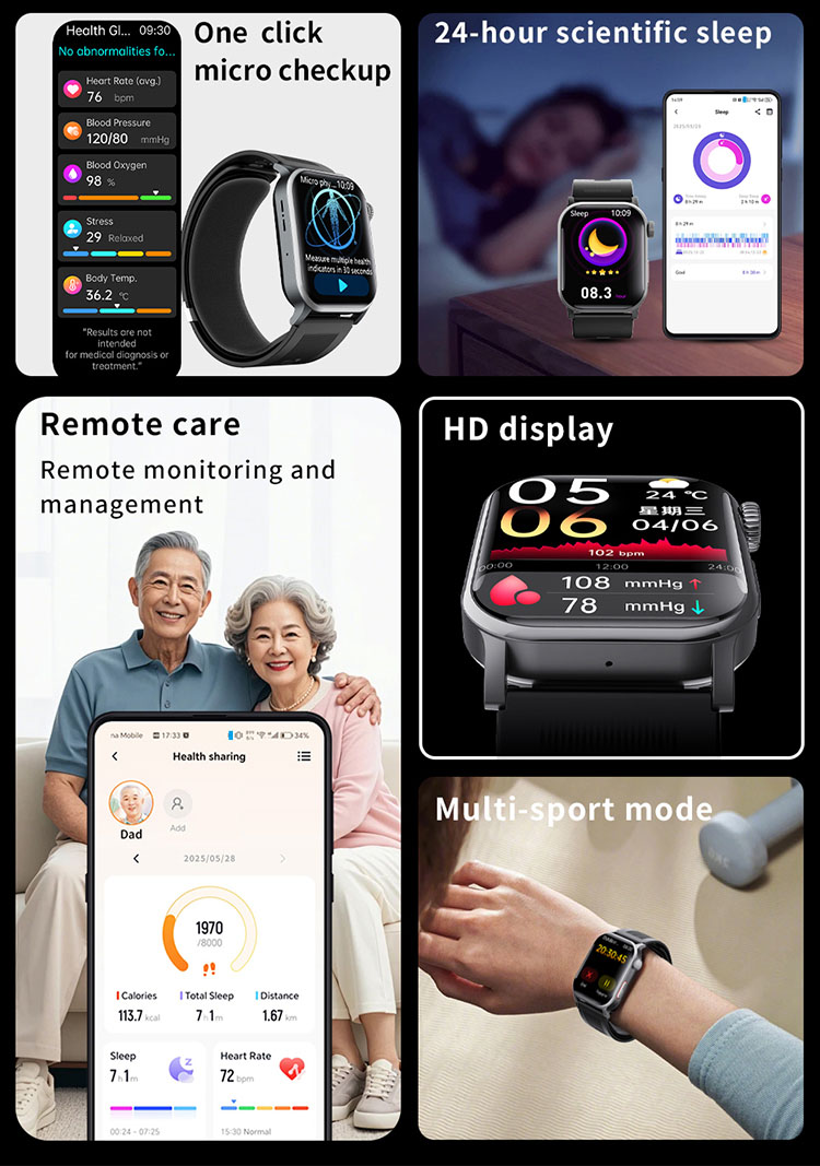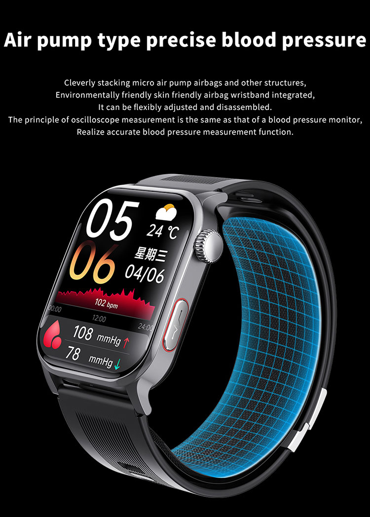 | Main functions | Important features: air pump blood pressure, medical grade ECG, heart disease risk assessment, 24-hour dynamic heart rate detection, mood management, depression risk assessment, 24-hour scientific sleep monitoring, red light blood oxygen, skin moisture analysis, cortisol detection, neural activity analysis, body composition, fall alarm, HRV report heart disease risk analysis, stress General functions: blood composition, methoxyphene, step counting, distance, calories, calls, voice assistant, heart rate, blood pressure, temperature test, breathing training, stopwatch, timer, calculator, call settings, time and date settings, mini-games, female menstrual cycle tracking, music playback, music control, remote photography, weather display, wrist raise to light up the screen, find phone (need to connect to APP), call reminder (caller number/name), message notification reminder, alarm reminder, standard reminder, sedentary reminder, heart rate alarm reminder, etc. |