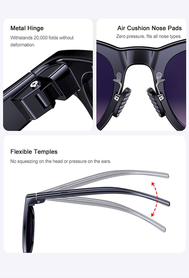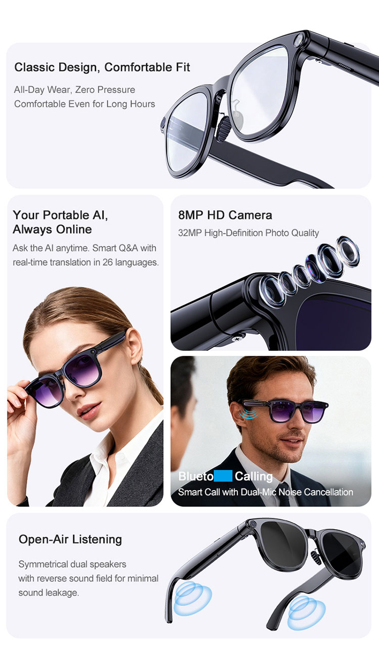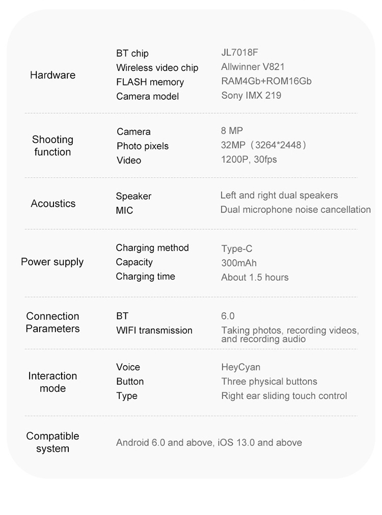 | Major function | 1, Shooting Function: 8MP HD camera for photos, 12MP anti-shake HD video recording 2, AI Translation: Dialogue translation (auto recognition), simultaneous interpretation (real-time translation) 3, AI Assistant: Integrated with Chat GPT large model, AI dialogue, rapid AI image recognition 4, BT Calling: Answer calls, reject calls 5, Other Functions: Music playback, voice recording, photography, video anti-shake, dual-mic noise cancellation, dual speakers, wear detection, Wi-Fi transfer, voice wake-up |