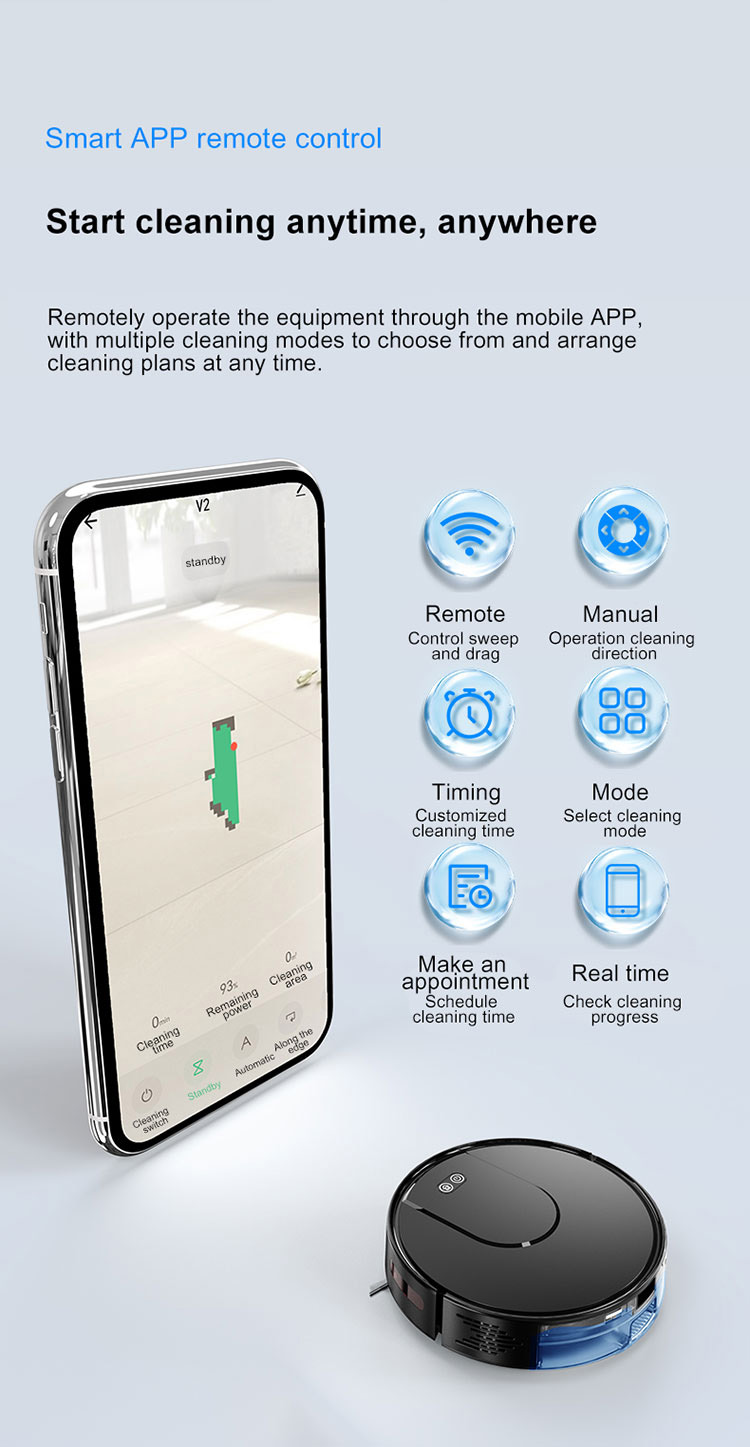 APP Remote Control: Manage your robot anytime, anywhere via the mobile app. Features include remote start/stop, scheduled cleaning, customized cleaning plans, and real-time progress tracking.