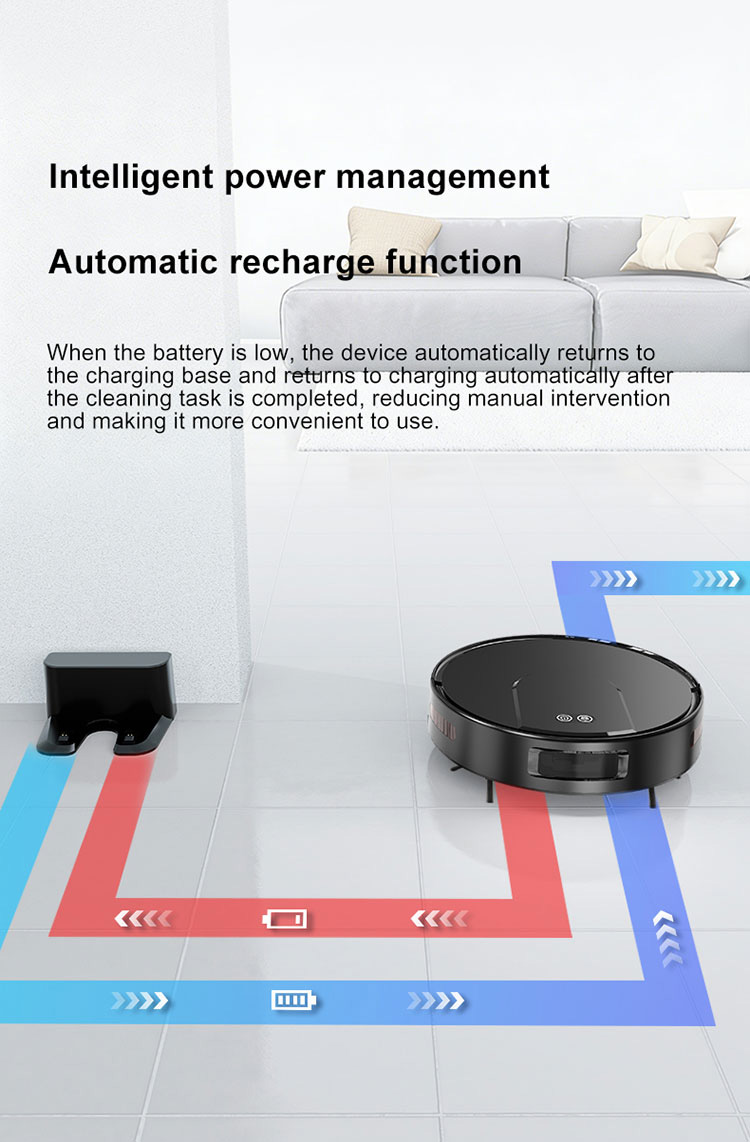 Automatic Recharge: When battery is low, the robot automatically returns to the charging dock.