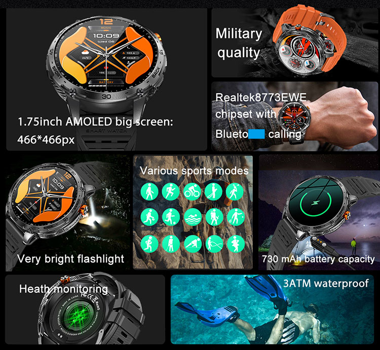 New K72 Smart Watch with GPS Compass Flashlight 580mAh Battery 3ATM Waterproof Outdoor Sports Fitness Tracker Smartwatch for Men