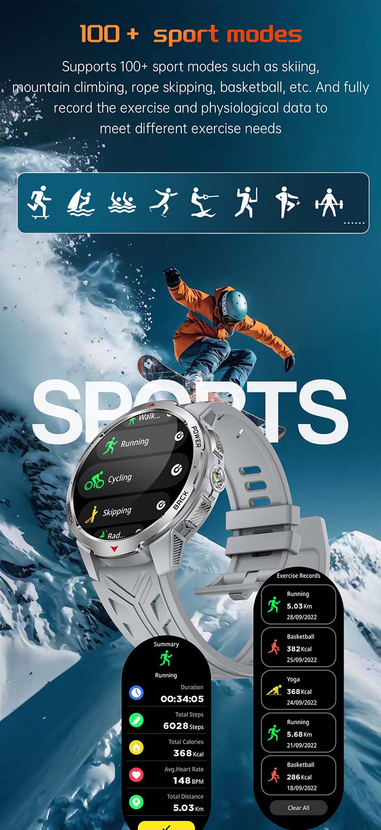 K67A GPS Sports Smart Watch LED Flashlight IP68 Waterproof Barometric Compass Altimeter AMOLED Smartwatch 530 mAh Battery